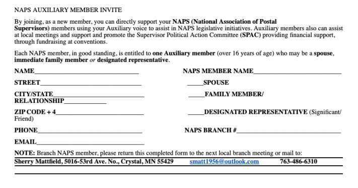 NOTE: Each NAPS member is entitled to name one spouse, family member, significant other or friend (required to be at least 16 years of age) to be their representative, joining our Branch 16 Auxiliary.